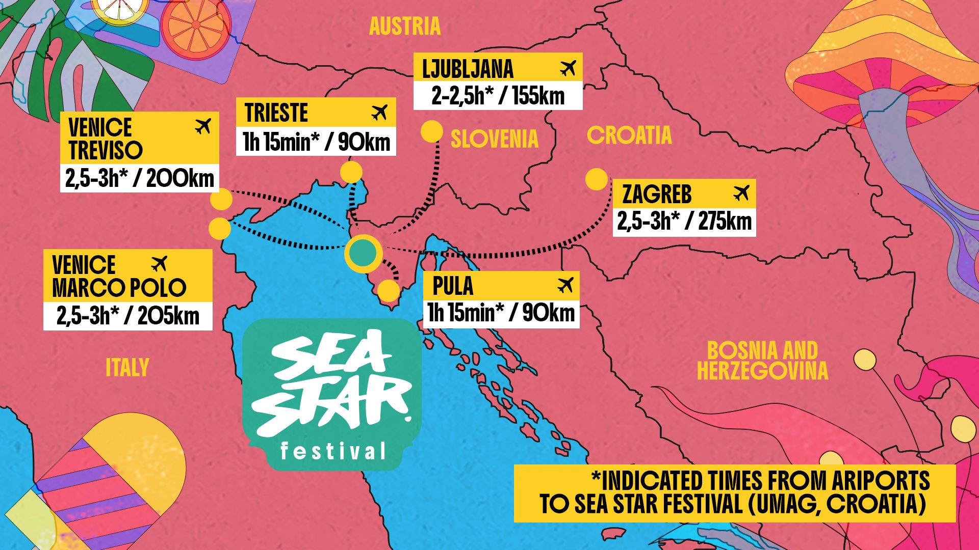 Umag sits right at the crossroads of Croatia, Slovenia, and Italy, making it one of the most accessible festival destinations in Europe. Smooth highways and coastal roads connect you from all directions.
