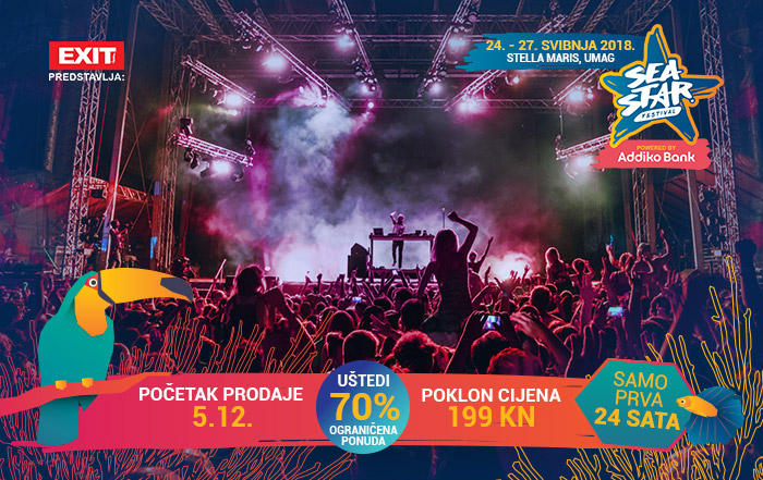 Sea Star, dvostuki nominirani za Europske festivalske nagrade i dobitnik Ambasadora za Najbolji novi festival, održati će se od 24. do 27. svibnja 2018. godine. Formula 2+2 pokazala se uspješna prve sezone pa će tako u petak 25. i subotu 26. svibnja, Sea Star Festival svirati u svojoj punoj snazi u sad već regionalno poznatoj laguni umaškog kompleksa Stella Maris. Četvrtak 24. će biti dan zagrijavanja, a nedjelja 27. svojevrstan “after party”, tijekom kojih će festival raditi u drugačijem formatu. Početak prodaje ulaznica tempiran je za utorak, 5. prosinca, kada stižu festivalske ulaznice po poklon cijeni od svega 199 kn, što je ušteda od čak 70% u odnosu na finalnu cijenu! Broj tih ulaznica veoma je limitiran količinom, a poklon cijena vrijediti će najdulje 24 sata.
